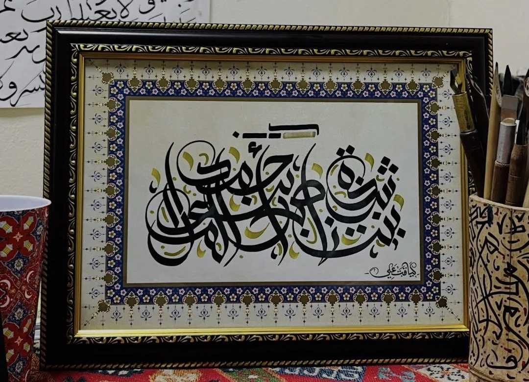 Our teacher, Liyakhath Ali (Liyakh) is a UAE-based Arabic modern calligraphy artist and Arabic language educator. Known for his fast and dynamic live calligraphy style, he captivates audiences through expressive demonstrations. Alongside his artistic work, he is dedicated to teaching, mentoring students, and conducting research to advance and preserve the art of Arabic calligraphy.